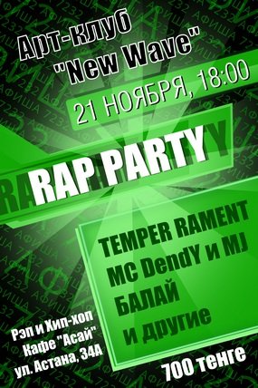 Арт-клуб "New Wave" продолжает радовать и развлекать поклонников рэпа и хип-хопа творчеством своих земляков и гостей нашего творческого города Усть-Каменогорск, и с радостью сообщаем что 21 ноября в кафе «Асай» по адресу ул. Астана, 34а пройдет очередное rap party, в котором мы услышим новые и старые треки, как молодых так уже и бывалых суровых РЭП исполнителей, таких как: