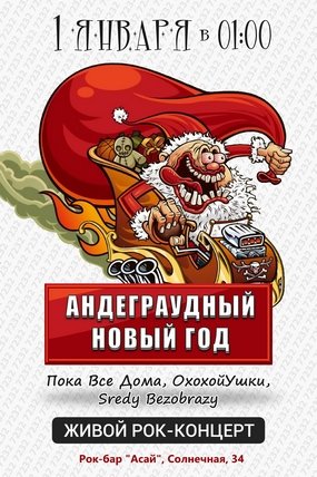 У вас ещё не было рока в новогоднюю ночь? Тогда будет! Самый что ни на есть роковый и неформальный тусняк. С металлом и рок-н-роллом и панком.