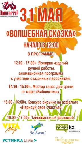31 мая 2015 года на уличной площадке Торгового Комплекса «Император» состоится детский праздник «Волшебная сказка». Специально для маленьких гостей и их родителей мы подготовили развлекательную программу. Чтобы дети оказавшись там почувствовали атмосферу праздника, мы превратили территорию Комплекса в настоящую сказку.