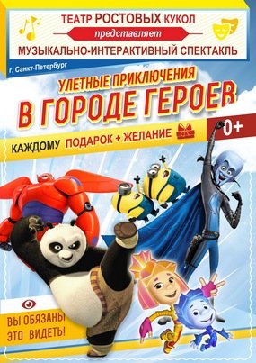 В программе интерактивный спектакль с любимыми героями, а именно Мегамоз, Фиксики, Серый Волк, Миньоны, Панда Кунг Фу, Бэймакс, Монстры Хай и многие другие.
