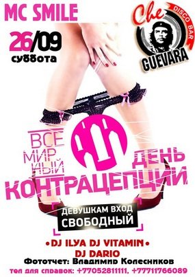 Чега всегда на гребне событий и в эту ночь мы за безопасный секс и счастливое будущее. В честь этого события, которое поддерживает весь мир, Че Гевара будет дарить тематические призы все желающим.